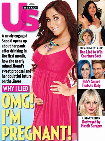 Hello, faithful readers. Didja miss me last week? I took a few days off to go get loaded in wine country and last week’s issue was on the tired subject of Courtney from the Bachelor, so I decided to spend my time doing something more productive – drinking loads of delicious wine. But now I’m back and yes, ladies and gentlemen, Snooki is preggers. Oh em gee! I learned more about her stupidity than I ever cared to know by reading this week’s issue of Us Weekly.