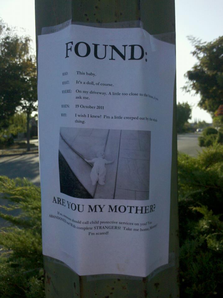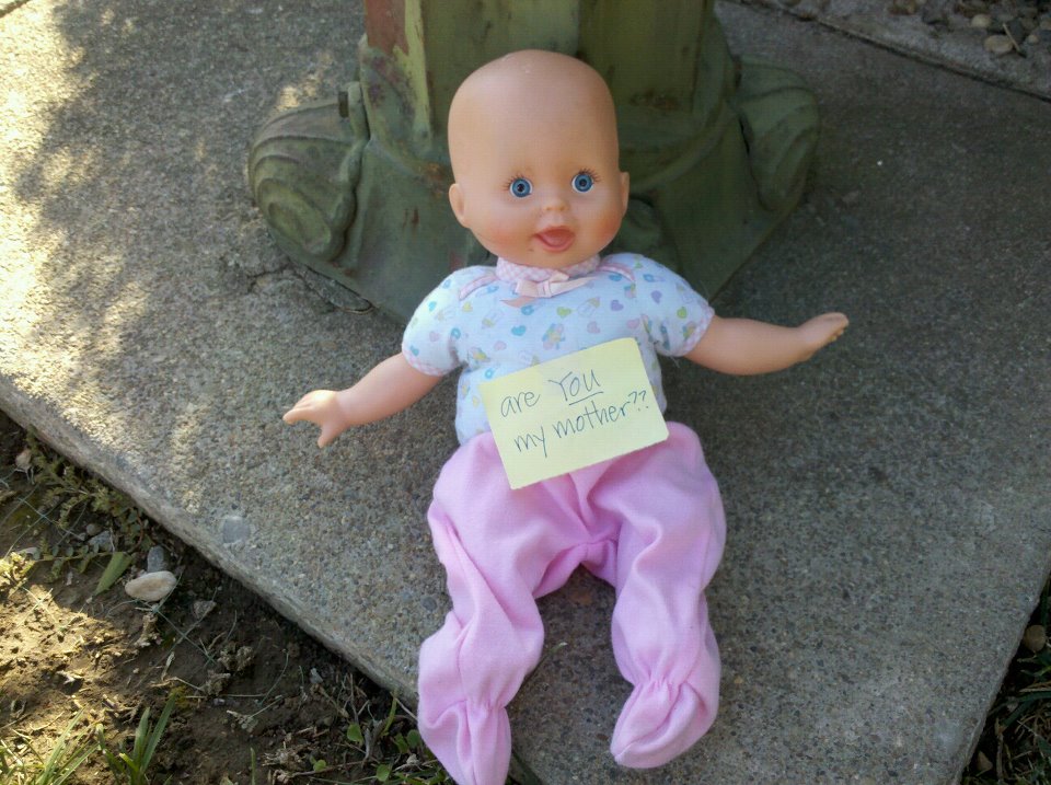 But I’m a good samaritan. I placed Baby Doe, as she is now called, against a lightpost and taped a little note to her tiny baby shirt.