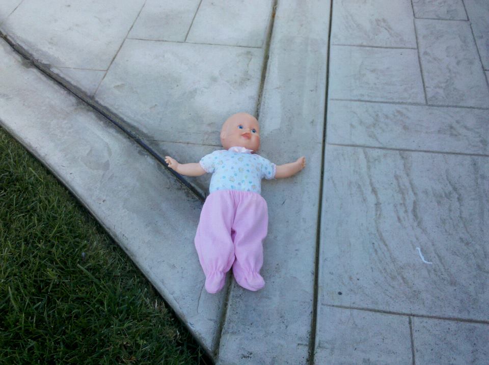 ME: Holy shitballs! Someone left a baby doll in my driveway. And what the hell were they doing so close to the garage??